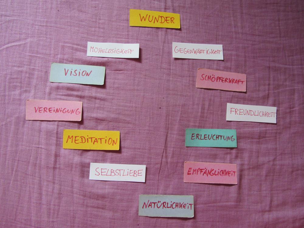 Ziehe ein oder mehrere ( bis zu 7) Kärtchen und fühle dich in den Energiestrom der Qualität(en) ein. Spüre wie es sich anfühlt, diese Qualität(en) in Dir zu haben, wie sie dich durchdringen und von dir aus in die Welt hinausstrahlen.